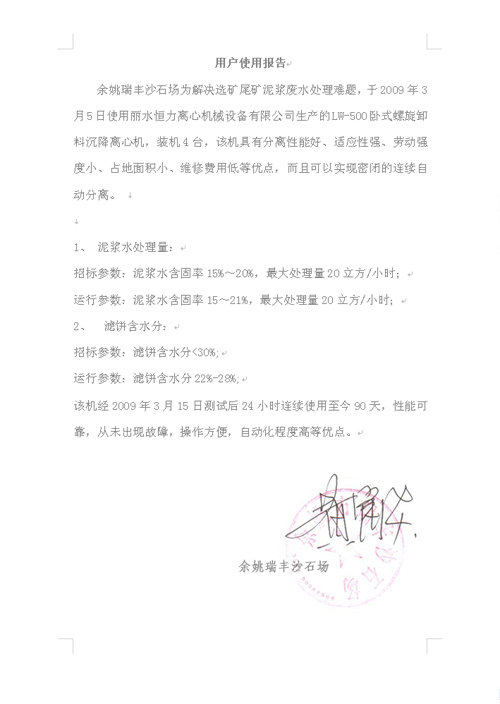余姚瑞豐沙石場(chǎng)為解決選礦尾礦泥漿廢水處理難題,于2009年3月5日使用麗水恒力離心機(jī)械設(shè)備有限公司生產(chǎn)的LW-500臥式螺旋卸料沉降離心機(jī),裝機(jī)4臺(tái),該機(jī)具有分離性能好、適應(yīng)性強(qiáng)、勞動(dòng)強(qiáng)度小、占地面積小、維修費(fèi)用低等優(yōu)點(diǎn),而且可以實(shí)現(xiàn)密閉的連續(xù)自動(dòng)分離。