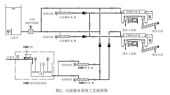 NOXON 臥螺離心脫水機的整體集成性能優(yōu)良,絮凝劑投加裝置、絮凝劑泵、污泥泵等均隨離心機配套供應,在自控系統(tǒng)的支持下,組成了一個有機整體,其工藝流程如圖 2 所示。