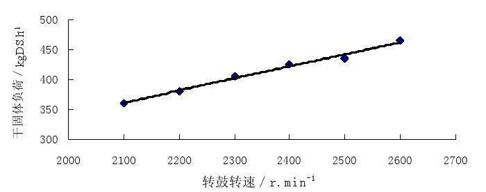 所謂干固體負荷是指每小時處理的不揮發(fā)固體重量,以 KgDS(干污泥)/h 表示。調(diào)整離心機的干固體負荷,對污泥脫水效果有很大影響,當進泥流量(即“水力負荷”)達到一定程度,所帶入的懸浮物含量超過了離心機所能承受的最大干固體負荷時,會造成泥餅含水率增加,上清液帶泥增多,此時應該減少進泥流量,使離心機脫出的上清液清澈在實際運行中,必須通過調(diào)整水力負荷,來保證進入離心機干固體負荷不超過離心機的最大承受能力,否則,多余的干固體將從上清液中排出,上清液的懸浮物會急劇增多,但脫水泥餅的產(chǎn)量并沒有增加。該廠使用的離心機,當轉(zhuǎn)鼓轉(zhuǎn)速為 2300rpm、進泥濃度為 35 g/L 時,離心機運行的干固體負荷可達 405kg/h。當離心機磚鼓轉(zhuǎn)速增加時,干固體負荷也會相應增加,圖 3 是最大干固體負荷隨離心機轉(zhuǎn)鼓轉(zhuǎn)速變化的曲線。