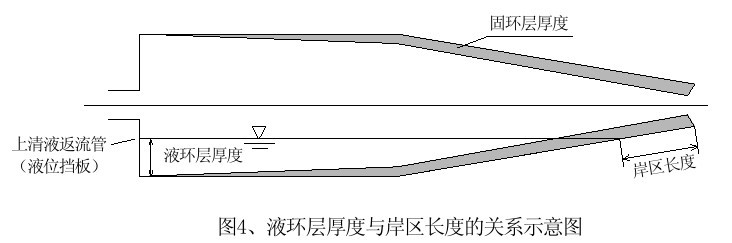 當進泥量一定時,如果液環(huán)層厚度較大,污泥在離心機內(nèi)的停留時間長,污泥在液環(huán)層內(nèi)進行分離的時間越長,會有更多的污泥被分離出來,并能夠降低某些小顆粒受擾動而隨分離液流失的可能性,但液環(huán)層厚度過大,會造成水隨脫水后的污泥從污泥出口溢出;如果離心機內(nèi)的液環(huán)層厚度較小,污泥在離心機內(nèi)的停留時間短,工作壓力不容易提高,但脫水后的污泥含水率也較低。綜合以上兩方面的作用,液環(huán)層增厚一般會提高脫水的固體回收率,但液環(huán)層增厚,相應會使岸區(qū)縮短,如上圖所示,使脫離液環(huán)層的污泥沒有充足的時間被甩干,因此泥餅含固率將下降。在控制液環(huán)層厚度時間應