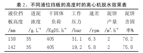 (6) 通過改變液位擋板的位置來調(diào)整離心機的液環(huán)層厚度,對離心機污泥脫水效果的影響非常大,必須通過反復的試驗,將液環(huán)層厚度設定在合適的水平,則可以保證污泥的含水率會降低,并且有較高的污泥產(chǎn)量;
