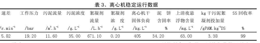 具體操作時,初始階段,按每公斤干污泥投加 6克 PAM 的投藥量,在保持絮凝劑投加量固定不變的前提下,通過調(diào)整污泥螺桿泵的轉(zhuǎn)速,按最大流量進泥,從低到高逐漸提高速差,直至上清也完全清澈,如果速差已經(jīng)提高到 7 r/min 以上,上清液的懸浮物含量仍然較多,說明進泥量已超過離心機的最大干固體負荷,此時按 100%、90%、80%、70%、60%、50%、40%的梯度逐漸降低進泥流量,直到出現(xiàn)良好的上清夜;經(jīng)過上述調(diào)整,待離心機運行穩(wěn)定后,逐漸降低絮凝劑的投加量,直至在最少的 PAM 的投藥量情況下,都能獲得良好的泥餅含固率和上清液含固率為止。離心機穩(wěn)定運行時的數(shù)據(jù)見表 3。