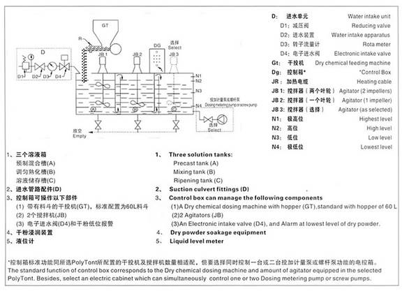 聚合物溶液制備過程是通過各個溶液箱逐步處理完成的,溶液箱之間隔開,保證每個溶液箱內(nèi)的最佳反應(yīng)時間和恒定的濃度,避免在預(yù)制混合槽和溶液儲存槽之間產(chǎn)生任何直接通路。PolyTont由控制箱自動控制,此控制箱與安裝在溶液儲存槽上的液位計相聯(lián),一旦液位達到“低位”,觸發(fā)電子進水閥打開,同時啟動干投機,干投量的大小與水量均可準確調(diào)定,以獲得精確的濃度。一旦達到“高位”此循環(huán)過程就停止。當然兩個攪拌器還在工作。
