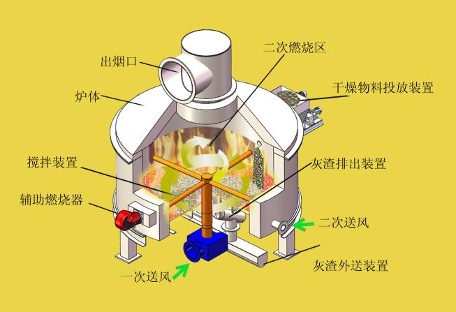 立式清潔焚燒爐系統(tǒng)(從冷風(fēng)進(jìn)口到熱風(fēng)出口以及從濕料進(jìn)口到灰渣出口止):包括“進(jìn)料裝置,立式清潔焚燒爐,鼓風(fēng)機(jī),出渣系統(tǒng),輔助燃燒器,動(dòng)力裝置”等組成;
